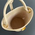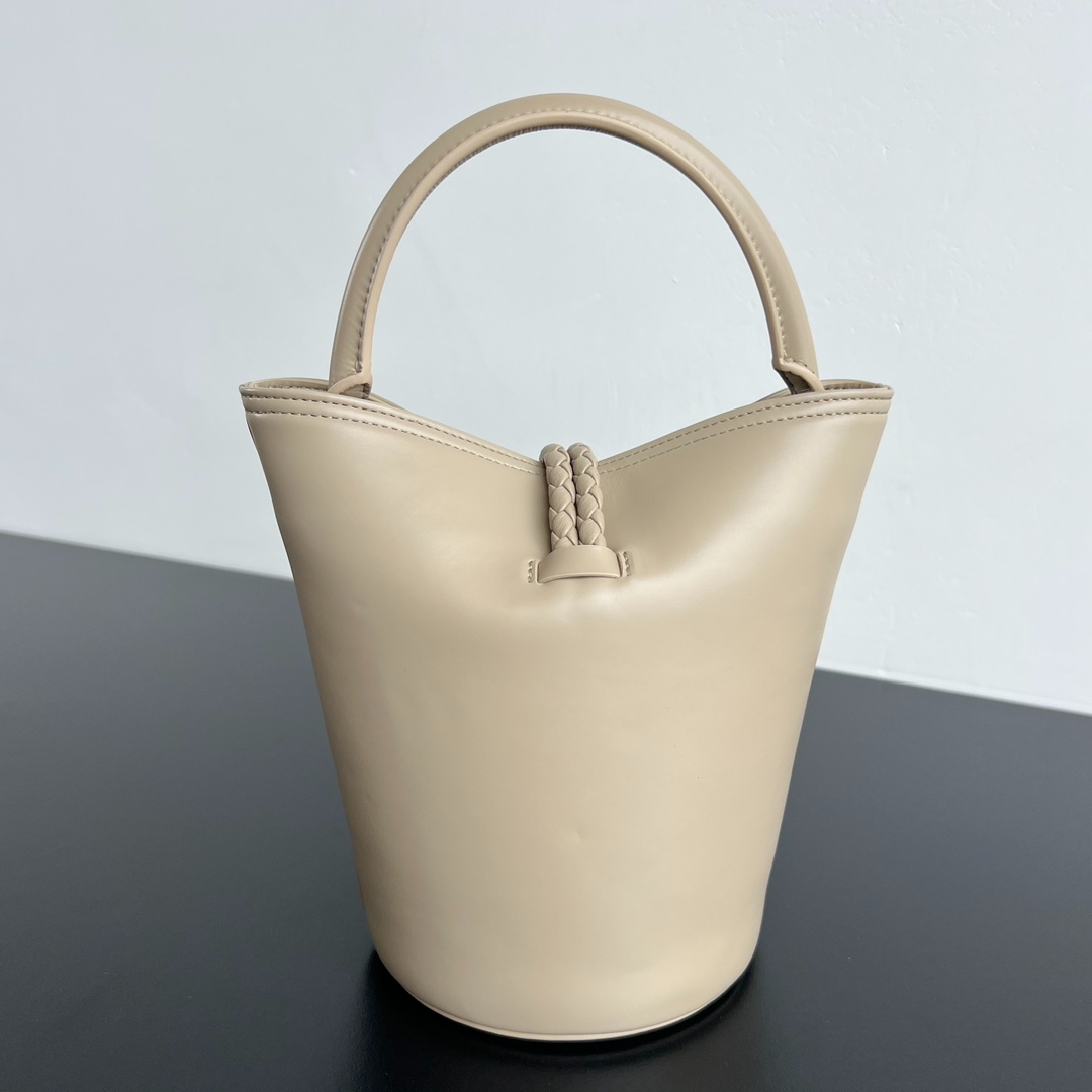 The BV 25 Early Spring New Liberta Bucket Bag (Style Number: 815244) is a sophisticated yet versatile accessory crafted from smooth cowhide with a suede lining. The bag's minimalist design is elevated by the braided knots and a horseshoe buckle metal ring, offering a unique yet timeless look. Featuring both top handles and an adjustable, detachable shoulder strap, this bag can be carried by hand, over the shoulder, or as a crossbody. Its adaptable size and chic design make it perfect for both workdays and casual outings, making it an essential addition to any wardrobe.