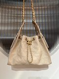 The Chanel Beige Apricot Bucket Bag is a chic and stylish accessory that embodies elegance and sophistication. Crafted from premium caviar leather, this bag features the iconic quilted design and is accented with a gold-tone CC logo and a gold chain drawstring. The small size makes it ideal for daily use or evening outings, offering both convenience and luxury. The combination of beige apricot color with gold hardware creates a timeless, versatile look that can complement any outfit.