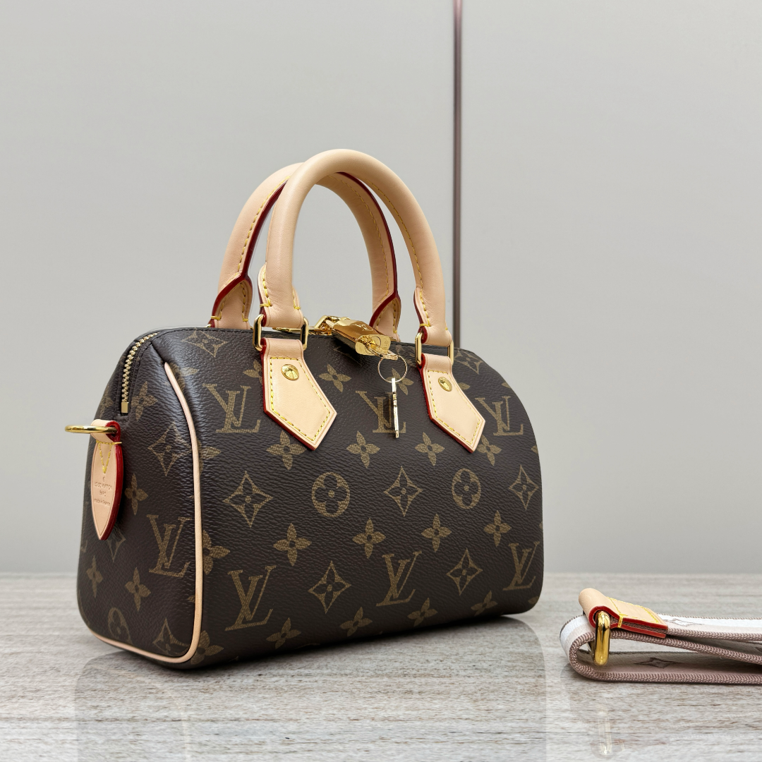 The Louis Vuitton Speedy 20 Beige (Item Number: M46222) is a compact yet luxurious bag, perfect for those who appreciate both style and practicality. Featuring the signature Monogram canvas, the bag is enhanced with beige leather accents and a distinctive red lining, giving it a refined, elegant look. The bag is also equipped with a convenient shoulder strap, providing versatility and ease of wear. A delicate key charm adds a unique finishing touch to this stylish piece.